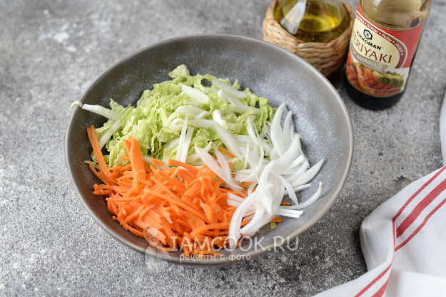 Тонко нашинкуйте пекинскую капусту, морковь и белый лук, сложите в удобную глубокую миску.