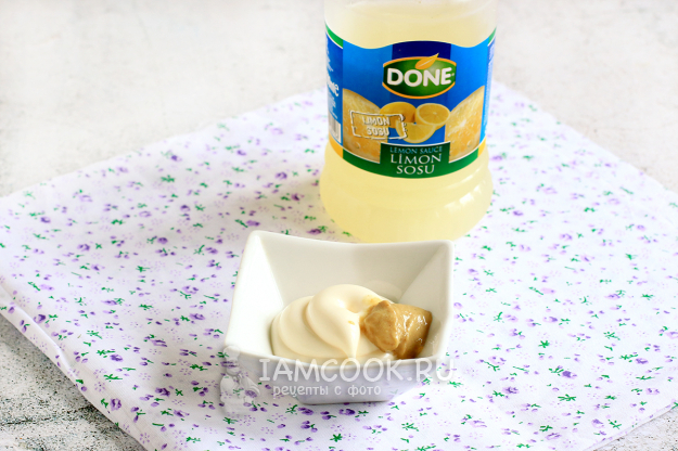 Сделайте заправку. Можно и не заморачиваться, а просто использовать майонез без добавок, но я люблю его в сочетании с горчицей и лимонным соком, тогда он более насыщен. Большое количество заправки не нужно делать, нам достаточно только склеить все ингредиенты между собой.