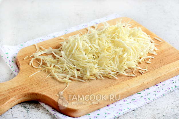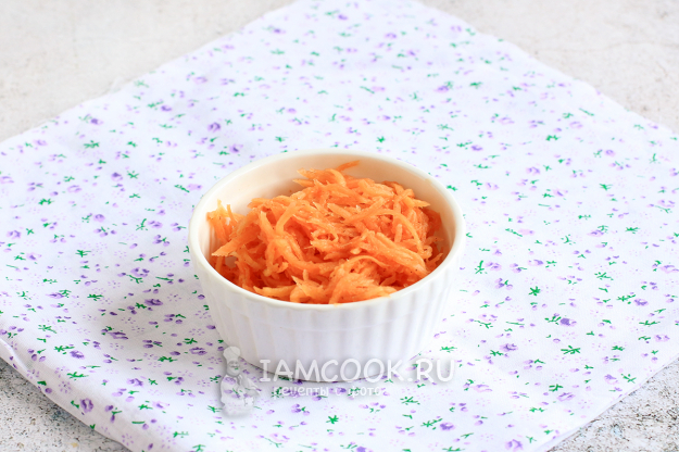 Морковь можно взять готовую по-корейски. Я приготовила ее сама: просто натерла корнеплод на корейской терке, слегка подсолила и добавила специи. Масло и чеснок не добавляла, лишь немного помяла руками для мягкости.