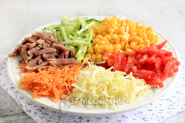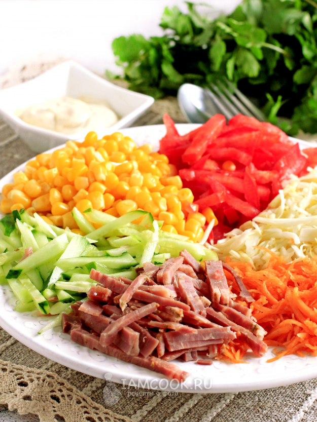 На удобном блюде или тарелке разложите все овощи, мясо, консервированную кукурузу, как лепестки ромашки - кучками. Соус можно поместить в середину композиции, а можно подать отдельно и тогда каждый человек будет смешивать салат в своей тарелке. Соль и перец тоже лучше добавлять при смешивании и по вкусу.