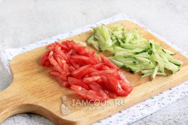 Подготовьте огурец и помидоры. Огурец слегка очистите от кожуры и нарежьте соломкой. Так же поступите с помидором, я не очищала его от кожицы, для меня это не принципиально. Так как зимние помидоры довольно плотные, то можно не убирать мякоть, но если они сочные - просто избавьтесь от лишнего сока.