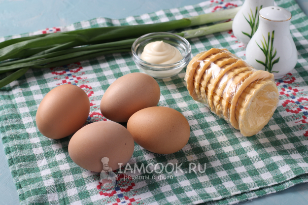 Для приготовления тарталеток с яйцом и луком подготовить из списка необходимые ингредиенты. Яйца сварить в течение 9 минут с момента закипания воды, затем остудить яйца под холодной водой.