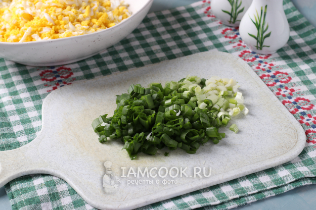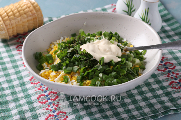 Добавить лук к натёртым яйцам, посолить и поперчить, заправить майонезом.