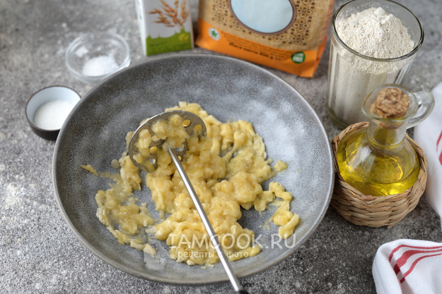 Спелый крупный банан очистите от кожуры, поломайте, положите в глубокую миску, разотрите до однородного состояния в помощью мялки для картофельного пюре.
