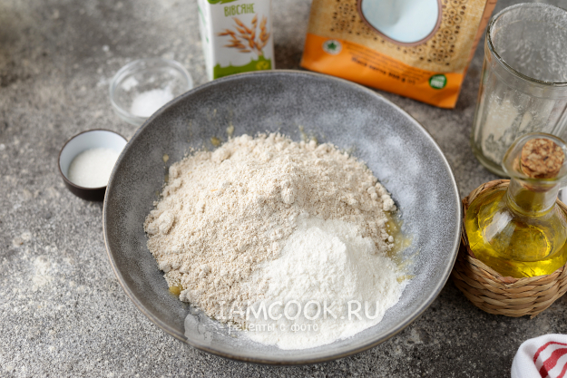 Всыпьте овсяную муку, добавьте рисовую ложками с небольшими горками, положите стевию или любой сахарозаменитель и соли щепоть.