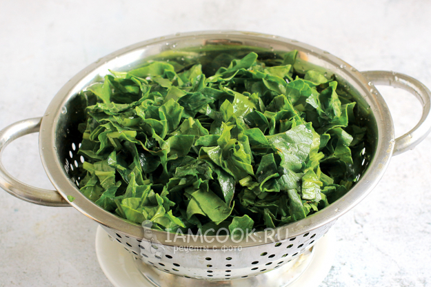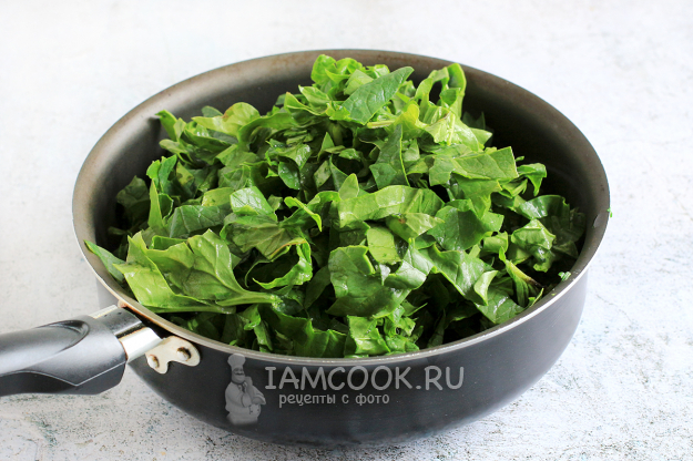 Тем временем приготовьте начинку. Свежий шпинат переберите, несколько раз промойте в воде, оторвите грубые черенки и нарежьте произвольно. Дайте лишней воде стечь.