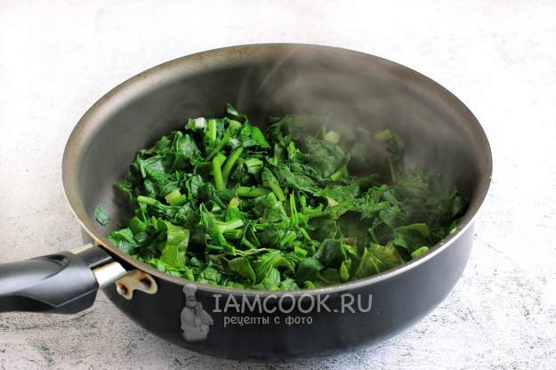 На сухую сковороду выложите рубленый зеленый лук, сразу же сверху добавьте шпинат и потомите на малом огне 5 минут. Так как шпинат влажный, то в сковороду масло или воду можно не добавлять. Если хотите получить более жирную начинку, то лук обжарьте в масле и только потом добавляйте шпинат. Под воздействием температуры и влажности шпинат сразу же уменьшается в размерах.