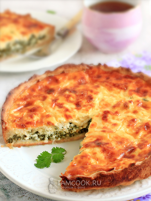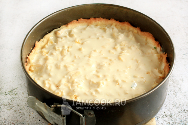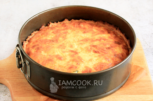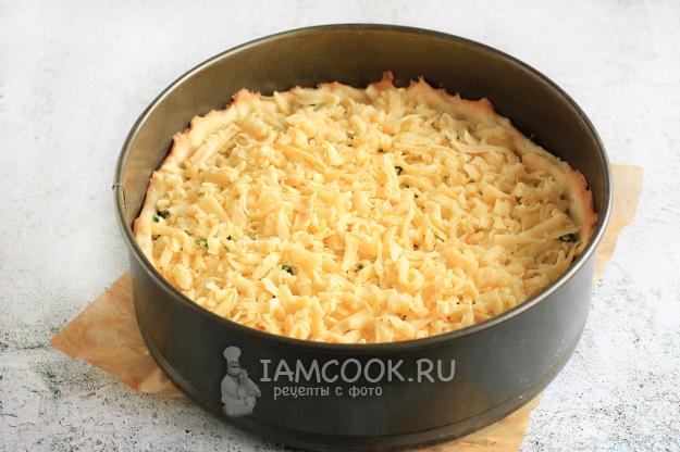 Подготовленную заливку вылейте поверх сыра. Снова поставьте пирог в горячую духовку (180 градусов) и выпекайте до появления румяной корочки сверху. Примерное время выпечки - 25 минут, но регулируйте весь процесс по своей духовке.