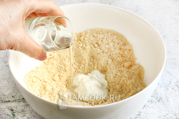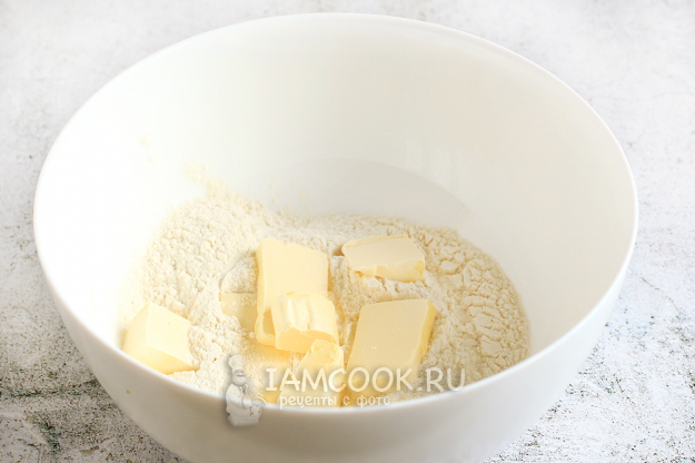 Муку соедините с солью и сахаром, добавьте холодное рубленое масло или маргарин и хорошенько перетрите все в мелкую крошку.