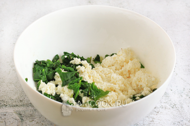 Затем соедините с творогом, посолите и поперчите по вкусу. Лучше всего, если творог будет немного с кислинкой.