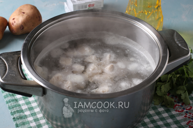 Когда филе сварится, добавить в бульон нарезанную картошку и зажарку. Варить до готовности картофеля.