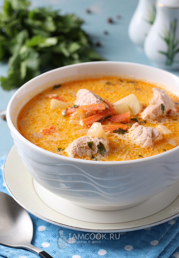 Для приготовления сырного супа из индейки с плавленым сыром подготовить из списка необходимые ингредиенты.