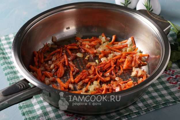 Приготовить зажарку. Разогреть в сковороде масло, добавить лук с морковью и обжарить до мягкости. В конце добавить паприку и перемешать.