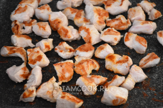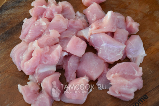 Филе индейки промыть, обсушить бумажным полотенцем и нарезать небольшими кубиками.