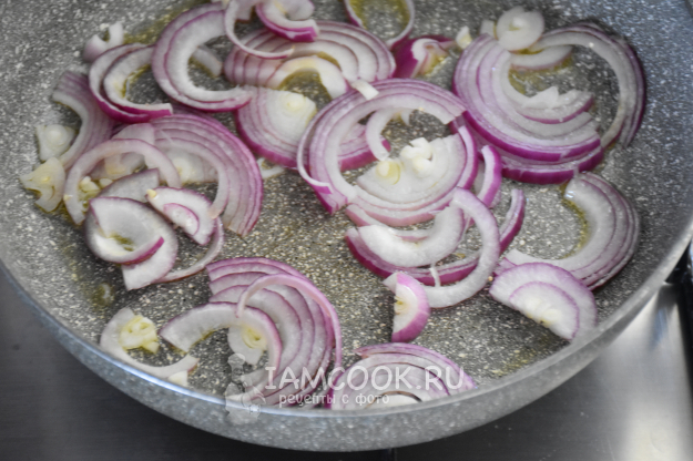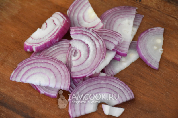 Красный лук нарезать полукольцами.