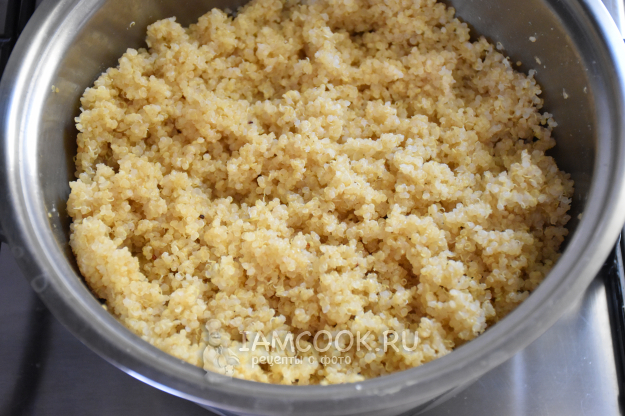 Киноа промыть холодной водой. В сковороде разогреть 1 ч.л. оливкового масла и обжарить киноа несколько минут. Добавить воду и посолить. Довести до кипения и варить 15-20 минут. Как только семена киноа откроются цветком и впитают воду, крупа готова.
