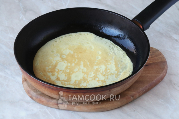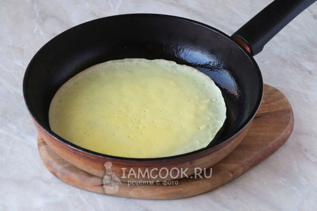 Сковороду смазать тонким слоем растительного масла и хорошо прогреть. Затем вылить порцию "отдохнувшего" теста, распределяя его по всему дну.