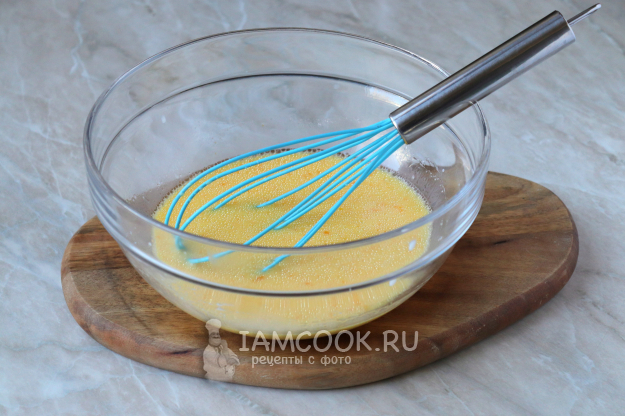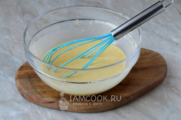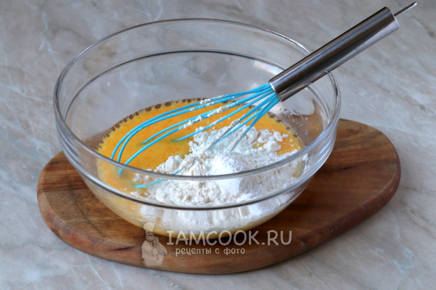 В яично-молочную смесь ввести подготовленную пшеничную муку и разрыхлитель.