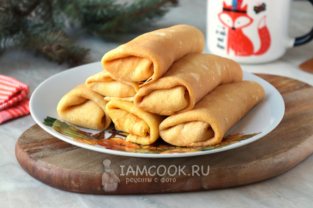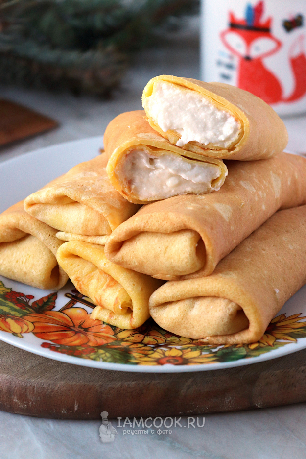 Вкуснейшие блины с творогом и бананом готовы, можно подавать на стол.