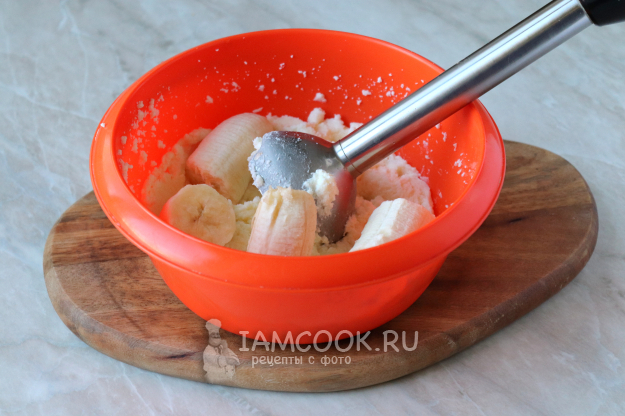 Для начинки соединить творог, сметану, сахар и мякоть банана.