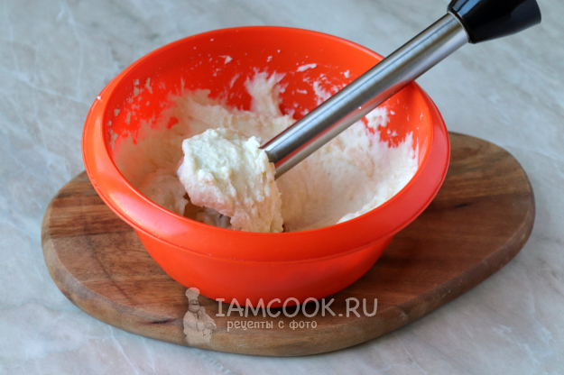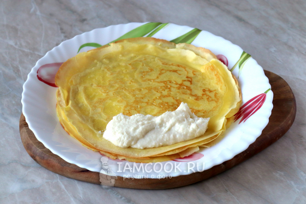 С помощью погружного блендера взбить массу до однородного состояния. Количество сахара и сметаны можно регулировать самостоятельно, учитывая кислоту и влажность творога. Начинка не должна получиться слишком жидкой, иначе она будет вытекать из блинов.