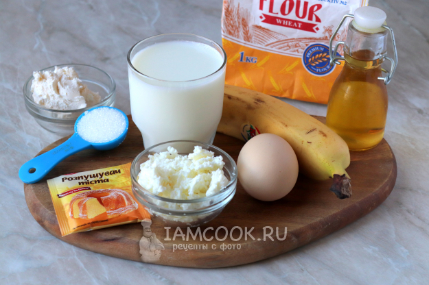 Для приготовления блинов с творогом и бананом в начинке необходимы ингредиенты из списка выше. Все продукты для теста должны быть комнатной температуры, мука - просеянная через мелкое сито.