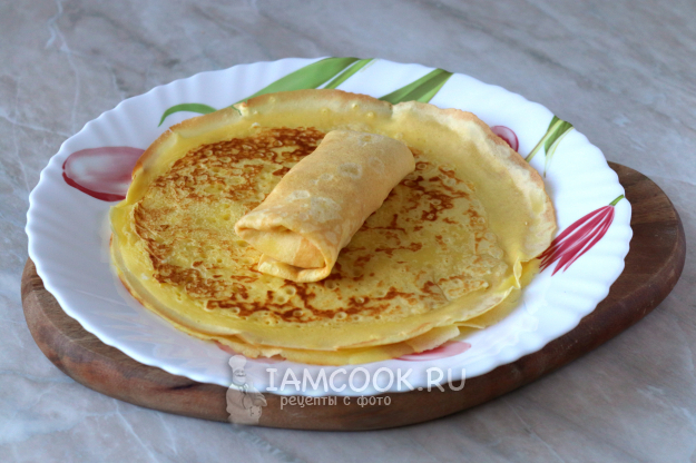 Жарить блин на среднем огне по 1-1,5 минуты с каждой стороны. Переворачивать с помощью деревянной лопатки. Из данного количества ингредиентов у меня получилось 7 тонких блинов.