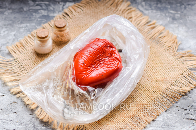 Тем временем достать перец из духовки, переложить перец в пакет, оставить на 10 минут, чтобы перец пропарился хорошо, тогда будет достаточно легко снять кожицу.