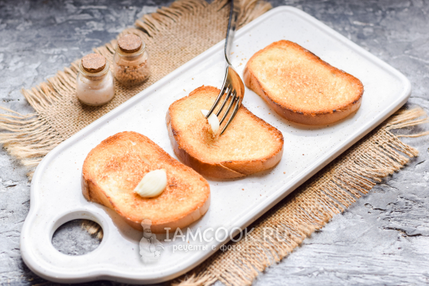 Зубчик чеснока очистить и разрезать пополам, натереть румяные кусочки батона чесноком.