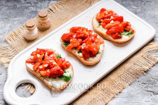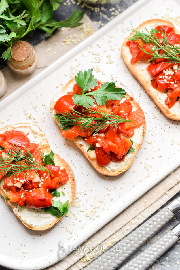 Выложить перец поверх петрушки, подавать бутерброды с болгарским перцем к столу.