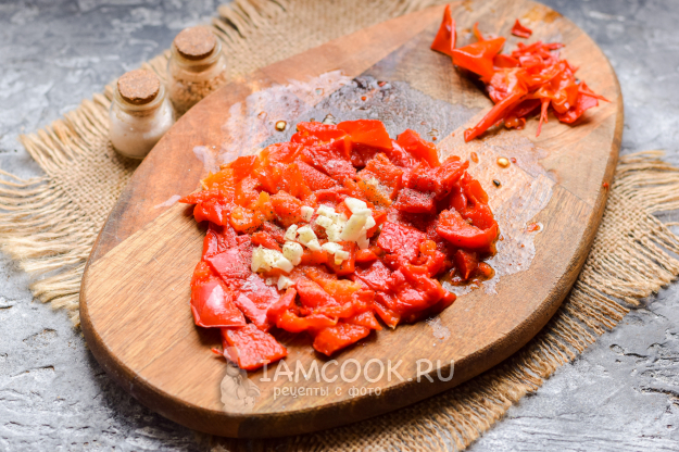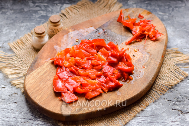 Очистить перец от кожицы, мякоть печеного перца нарезать небольшими кубиками.