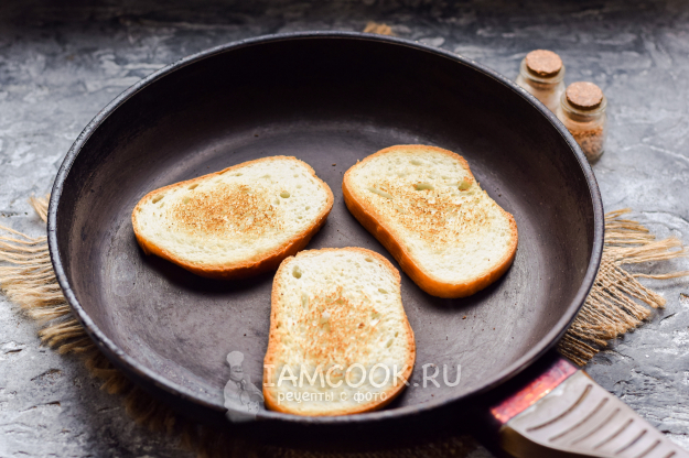 Пока перец запекается, подготовить ломтики батона - выложить на горячую сухую сковороду, подсушить батон с каждой стороны по несколько минут, до румяной корочки.