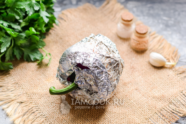Болгарский перец ополоснуть и просушить, после обернуть перец в фольгу, отправить в предварительно разогретую до 200 градусов духовку. Запекать перец 25-30 минут.