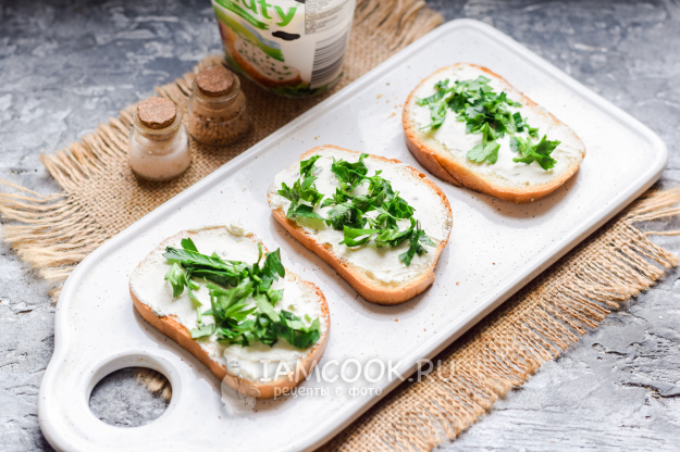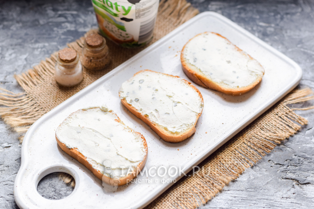 После смазать каждый ломтик батона творожным крем-сыром. У меня был сыр с добавлением зеленого сушеного лука, можно взять обычный чистый сыр, сливочный.