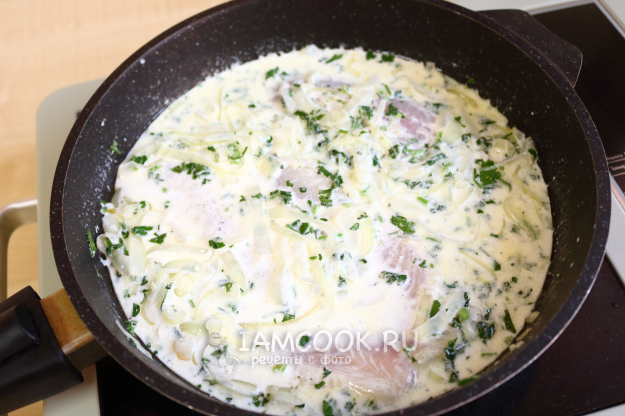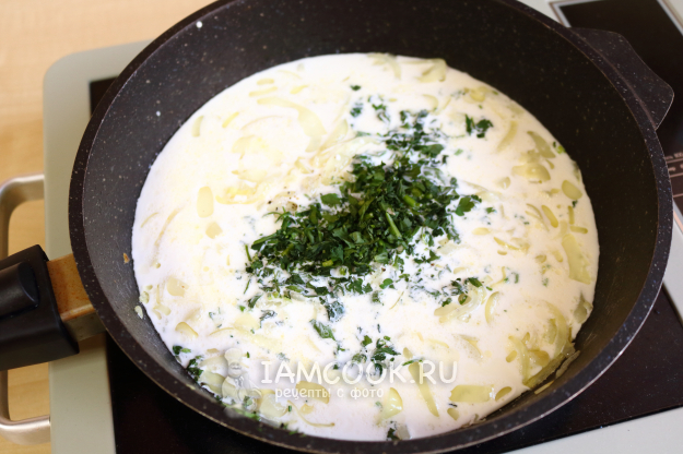 Вливаем сливки (комнатной температуры), солим и перчим, добавляем рубленую петрушку. Перемешиваем.