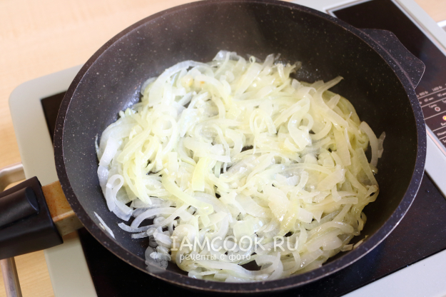 Выкладываем лук и чеснок на сковороду со сливочным маслом и томим на небольшом огне 10 минут до мягкости.