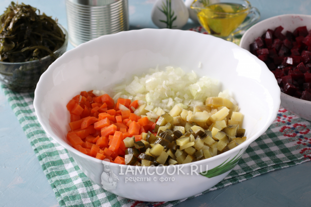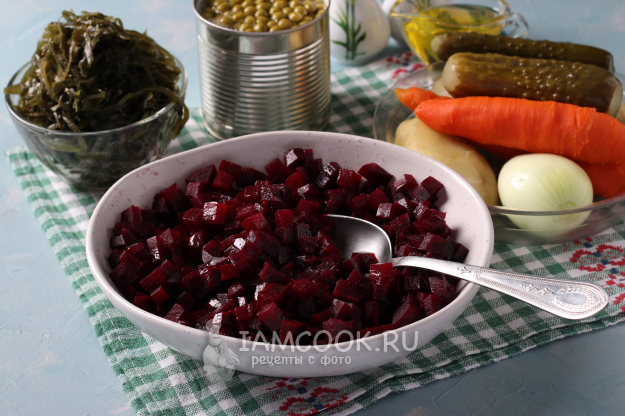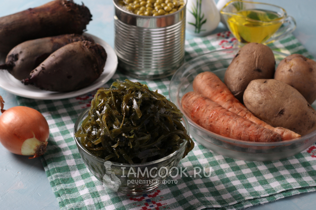 Для винегрета с морской капустой подготовить из списка необходимые ингредиенты. Потребуется заранее сварить морковь, свеклу и картофель.