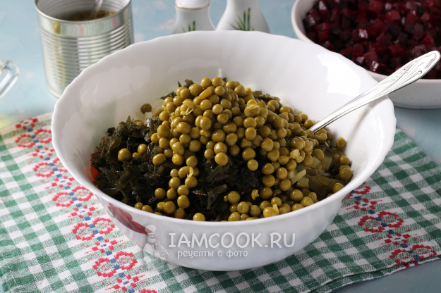 Добавить консервированный горошек и оставшееся постное масло, хорошо перемешать.