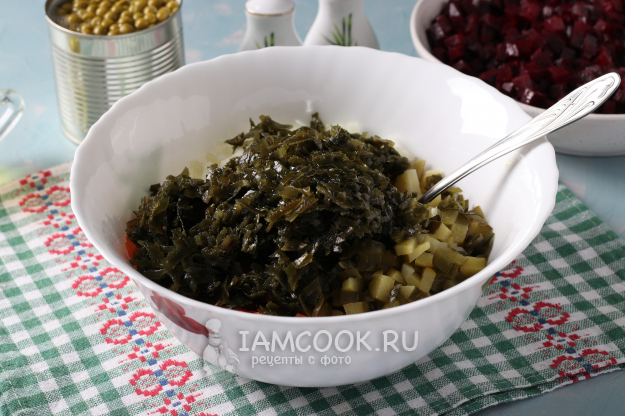 Переложить винегрет с морской капустой в удобный салатник или сразу разложить по порциям и подать к столу.