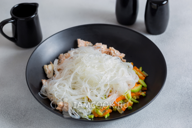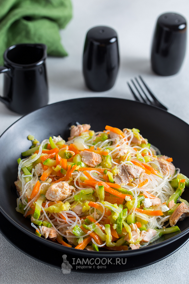 Фунчоза с рыбой и овощами готова. Приятного аппетита!