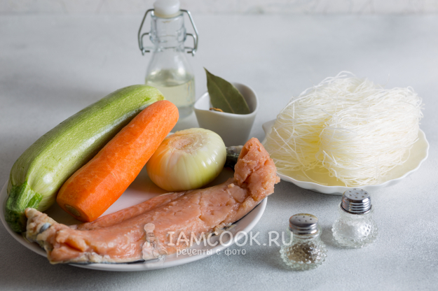 Подготовьте указанные выше продукты для приготовления фунчозы с рыбой и овощами. Если рыба замороженная, то её следует предварительно разморозить. У меня - филе рыбы, но в данном рецепте это не обязательно. Из овощей я беру молодой кабачок, морковь и лук, их можно заменить и другими овощами по своему вкусу.