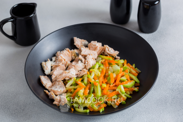 Тёплую рыбу и овощи выложите в глубокую миску. Рыбу предварительно разберите на кусочки, убирая косточки.