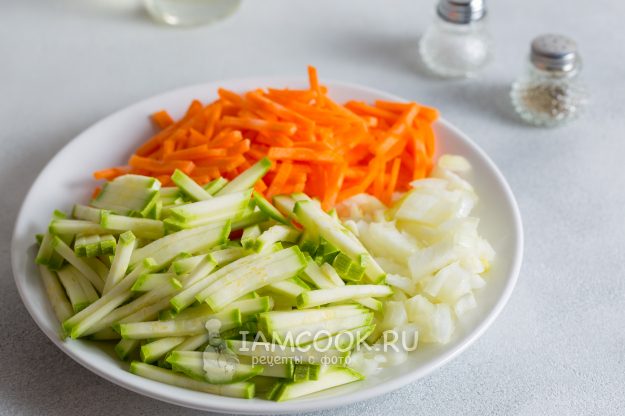 Овощи помойте. Лук и морковь очистите от шкурки. Кабачок у меня молодой, поэтому шкурку я не срезаю. Порежьте овощи произвольно - соломкой, кружочками.