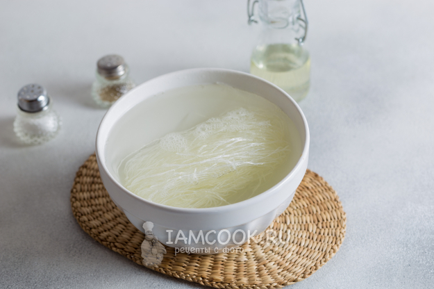 Фунчозу приготовьте согласно инструкции на упаковке. Для готовности моей лапши её следует залить кипятком и оставить на столе на 5-7 минут. Затем воду слейте, откинув фунчозу на дуршлаг.