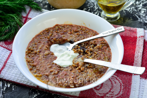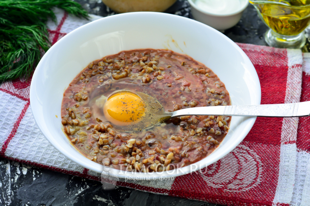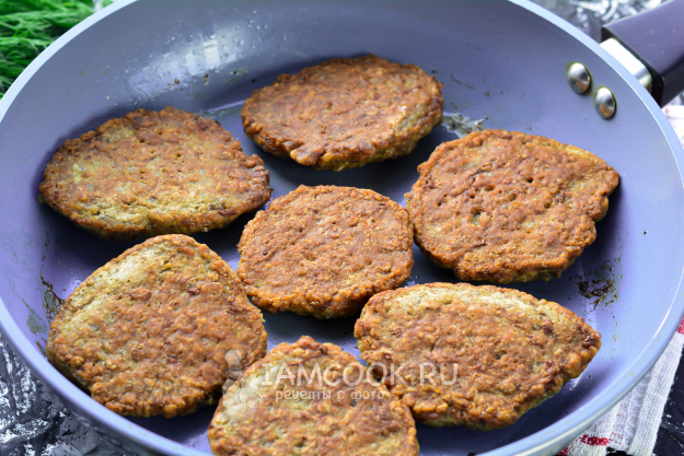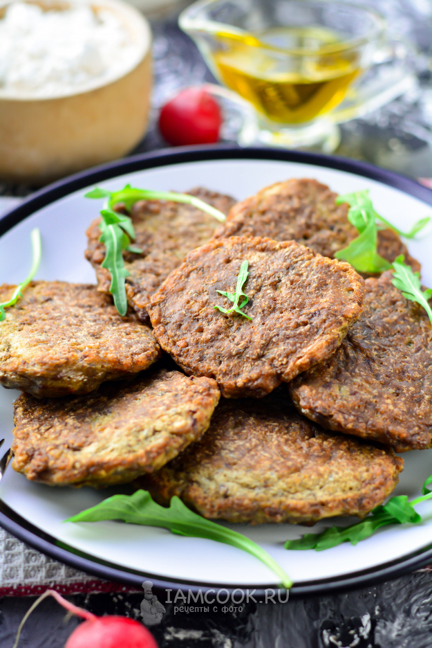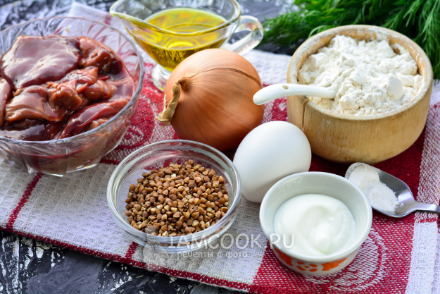 Возьмите ингредиенты для приготовления оладий из куриной печени с гречкой.