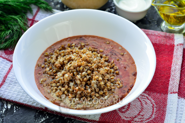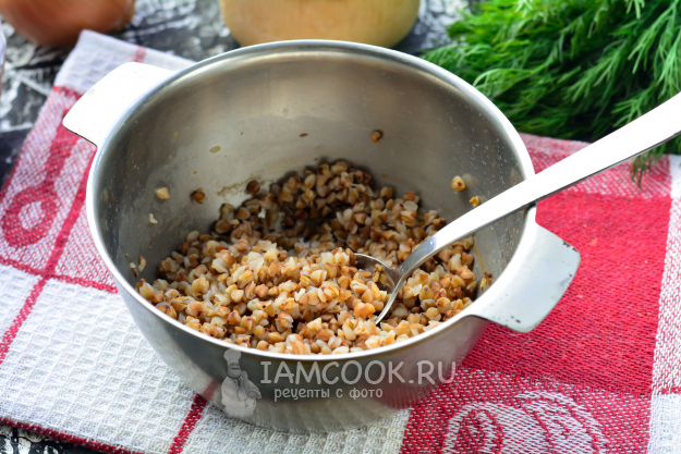 Промойте гречневую крупу, всыпьте в кипящую подсоленную воду, варите до мягкости примерно 15-17 минут. Затем кашу остудите.