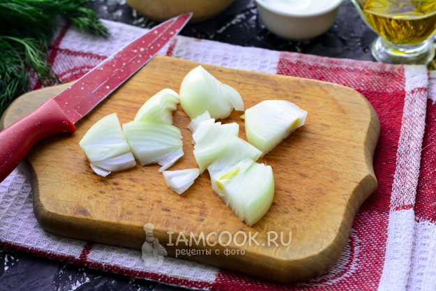 Почищенный репчатый лук нарежьте средними ломтиками.