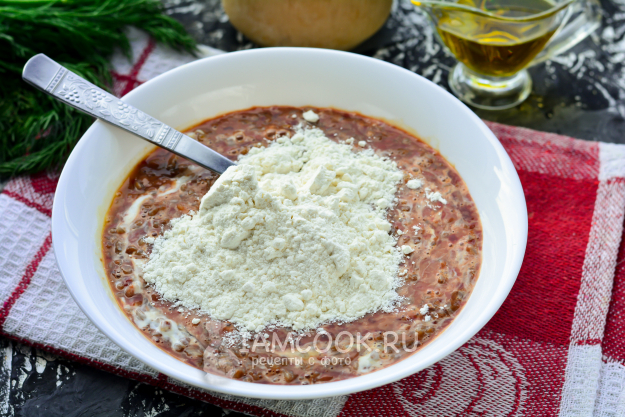 Затем всыпьте пшеничную муку и перемешайте фарш.