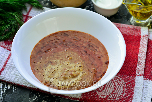 Добавьте сметану и соду, хорошенько перемешайте. Благодаря этим компонентам оладьи станут пышными и мягкими.