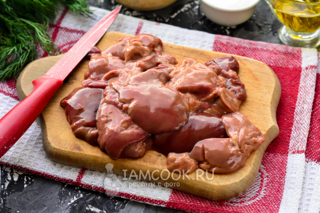 Промойте куриную печень, нарежьте средними кусочками, обрезав пленки.